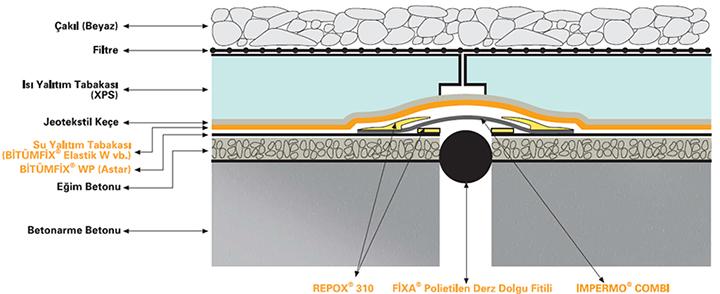 Bitüm esaslı ürünler ile teras çatı yalıtımı: Astar olarak BİTÜMFİX WP Astar yaklaşık % 20 su ile karıştırıldıktan sonra püskürtme makinesi veya bitüm fırçası ile uygulanır. Astarın kurumasından sonra üzerine iki kat BİTÜMFİX ELASTİK, BİTÜMFİX ELASTİK W, BİTÜMFİX ER 2K veya BİTÜMFİX BC 2K ürünlerinden tercih edileni yerine göre mala, bitüm fırçası veya püskürtme yolu ile sürülür. Katlar arasına IMPERMO Su Yalıtım Filesi veya 100 g/m2 geotekstil keçe konması ve kuruyana kadar beklenmesi tavsiye edilir. Teras çatının üzerinde gezilmeyecekse, yapılan uygulamayı zararlı UV ışınlarından korumak için uygulama üzerine ALUFİX Alüminyum Bitüm Esaslı Yansıtıcı Boya tek kat uygulanır. Eğer teras çatının üzerinde gezilecekse uygulamanın üzerine 150 g/m2 geotekstil keçe konması ve koruma şapı atılması tavsiye edilir. Yalıtımın teras çatının yan duvarlarında kaplamanın bitiş kotundan en az 15-20 cm daha yükseğe çıkartılması gerekmektedir. Yalıtım parapetin üzerine taşırılarak üzerine mermer veya harpuşta konmalıdır.